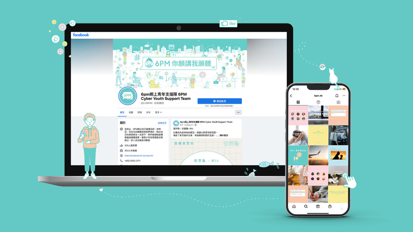 建立品牌形象後,我們亦開始下一步 - 製作網頁、社交媒體及宣傳品。我們利用大量主題為個人日常靜態活動及 Cyber Youth 的插畫,去營造「6PM」年輕、開朗、親切的感覺,並加入流行元素作彩蛋,如:IG、姜Man、School idol project、鴨仔、BTS、小薯茄…… 去令觀者產生共嗚。我們深明社工應該專注於服務對象,而不是營運網頁及社交媒體上,因此,我們在設計上制定了框架、內容建議及模板,具系統性的配套讓社工們易於使用。這一系列設計和策略都能令品牌統一、持續發展,建立一個嶄新品牌。